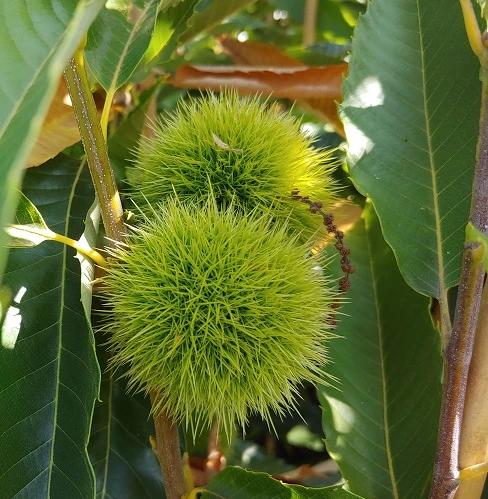 Zwei Esskastanien-Sorten auf einem Stamm. Duo-Obstbäume haben den Vorteil, dass auf kleinem Raum zwei verschiedene Sorten angebaut werden können. Die beiden Sorten befruchten sich gegenseitig, sodass ein hoher Ertrag gewährleistet ist.