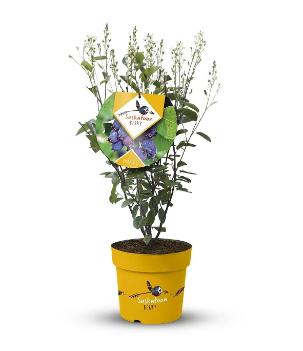 Das natürliche Verbreitungsgebiet der Saskatoon Berry liegt in Nordamerika. Die Pflanze gehört zu den Kernobstgewächsen, wächst mehrtriebig, aufrecht und wird zwischen 2 und 3 Meter hoch. Zunächst sind die saftigen Früchte rötlich, verfärben sich bis zur Reife aber in ein purpur-schwarzen Farbton. Die Früchte werden roh oder verarbeitet verzehrt, wobei sie sich ausgesprochen gut für Gelee, Saft oder Muffin & Kuchen eignen. Neben viel Vitamin C ist die Frucht reich an Antioxidantien und Anthocyanen und wird seit Jahrhunderten in der Naturheilkunde eingesetzt. Die Pflanze fruchtet am einjährigen Holz, wodurch ein Rückschnitt eine zweite Blüte und eine erneute Ernte ermöglicht. Aus den erlenähnlichen Blättern kannTee zubereitet werden. Im Mai ist die Zeit der auffallenden Blüten. Diese stehen in aufrechten, dichten Trauben und hüllen die Pflanze in weiß. In ihrem Verbreitungsgebiet findet man die Saskatoon Berry auf mäßig trockenen bis frischen, schwach sauren bis stark alkalischen, sandigen, kiesigen oder lehmigen Böden. Der Standort sollte sonnig bis halbschattig liegen. Die Pflanze ist absolut frosthart.